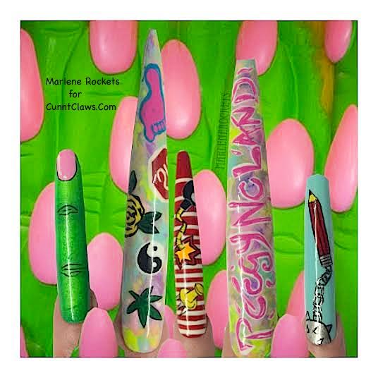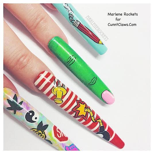 With that being said, on this segment of Artist HIGHlight– timeless designer, Coco Chanel wise words has manifested itself, as fashion is “what’s- happening” too on the nail art scene. Throughout the market, admired nail artist display inspirations from their favorite fashion trends and designers. Trish of Marlene Rockets is the prime example as she unravels her creativity to the inspirations of one of her favorite designer, Peggy Noland. Inspired by Japanese streetwear and Pop Art, Peggy Noland ensembles has been seen on some of our favorite outlandish gals such as; Lady Gaga, Rihanna and Brooke Candy. In addition to the brand’s influence the, American fashion designer designs can also be seen in publication such as WWD, Interview and New York Times to list a few. These bad boys below are sooooo creatively rad! Topic of discussion? or nah? Let’s see: