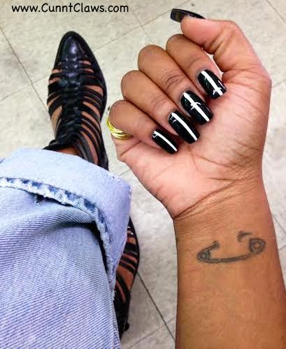 Haaaaa, just look around, the inspiration is usually dead smack in front of you, and you don’t even know it! I was totally indecisive about my design- more so in the color of useage which match my mood ( I call it, “Nailer’s-Block“). So having nailers-block for sometime this week, I look down at my shoes and was instantly inspired by the lineage style on my seasonal ankle shoes from two seasons ago, which reminded me of a designed I had from my past nail-art archives. As you can see, there was not much mental thinking used in regards to design execution: Just all black nail polish [ American Apparel: Hassid] and a simple white vertical line with a striper down the middle[ striper name unknown].Waahhla, and there goes the nail-art for, Cunnt Claws Nail’d! (Pow!). Hope you guys like!! ^-^: