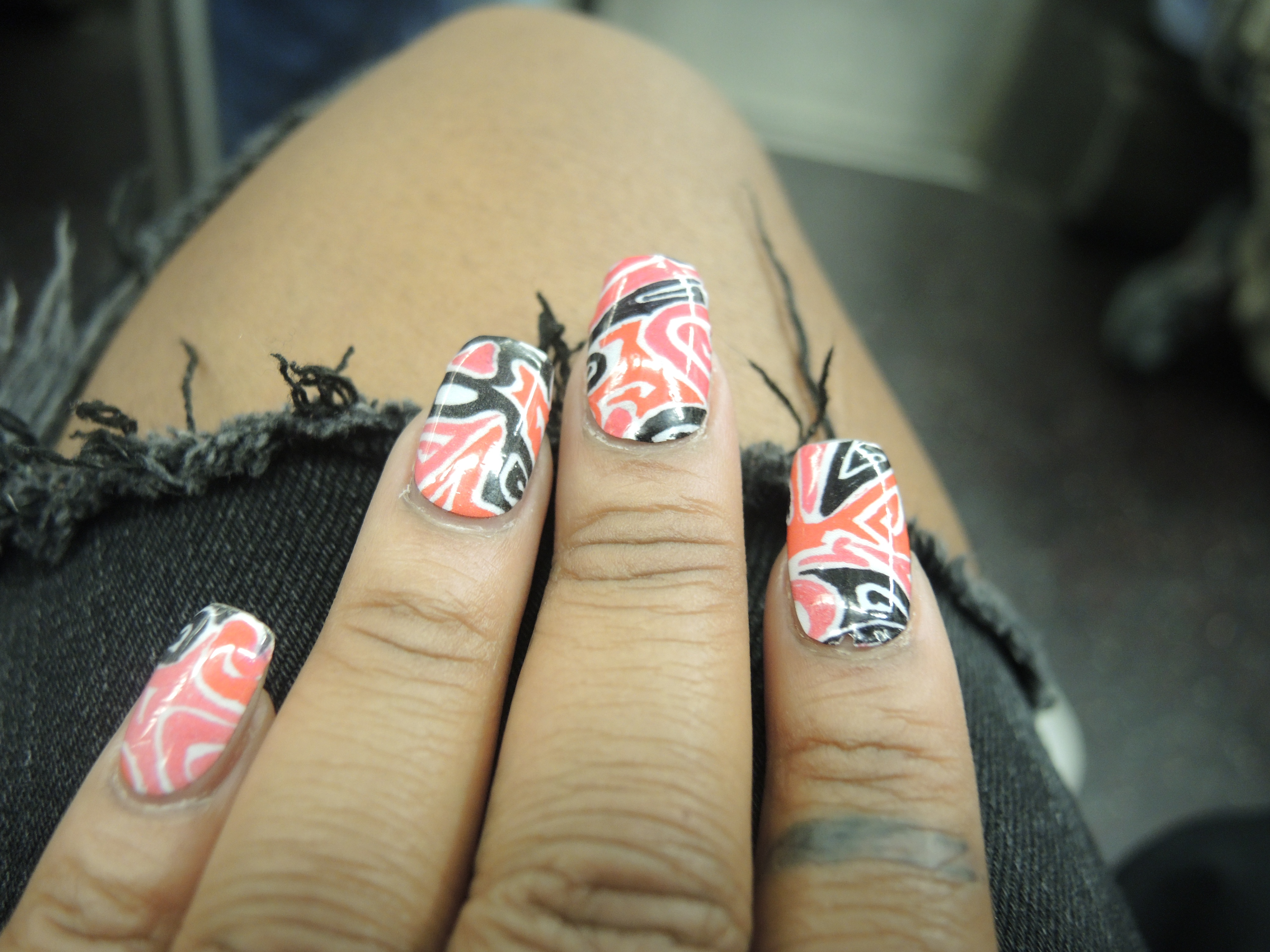 Leah Moloney design these particular 3-colored sets. From afar the design appears, geometric but when looking closely they kind of remind me of being in a lab, watching bacteria floating around in a microscope! Adding extra personality to the print, Yoko Ono [water decal] digital image from our [Dope Digits], Spring designs were added! My claws are representing collaborative placements of designs: