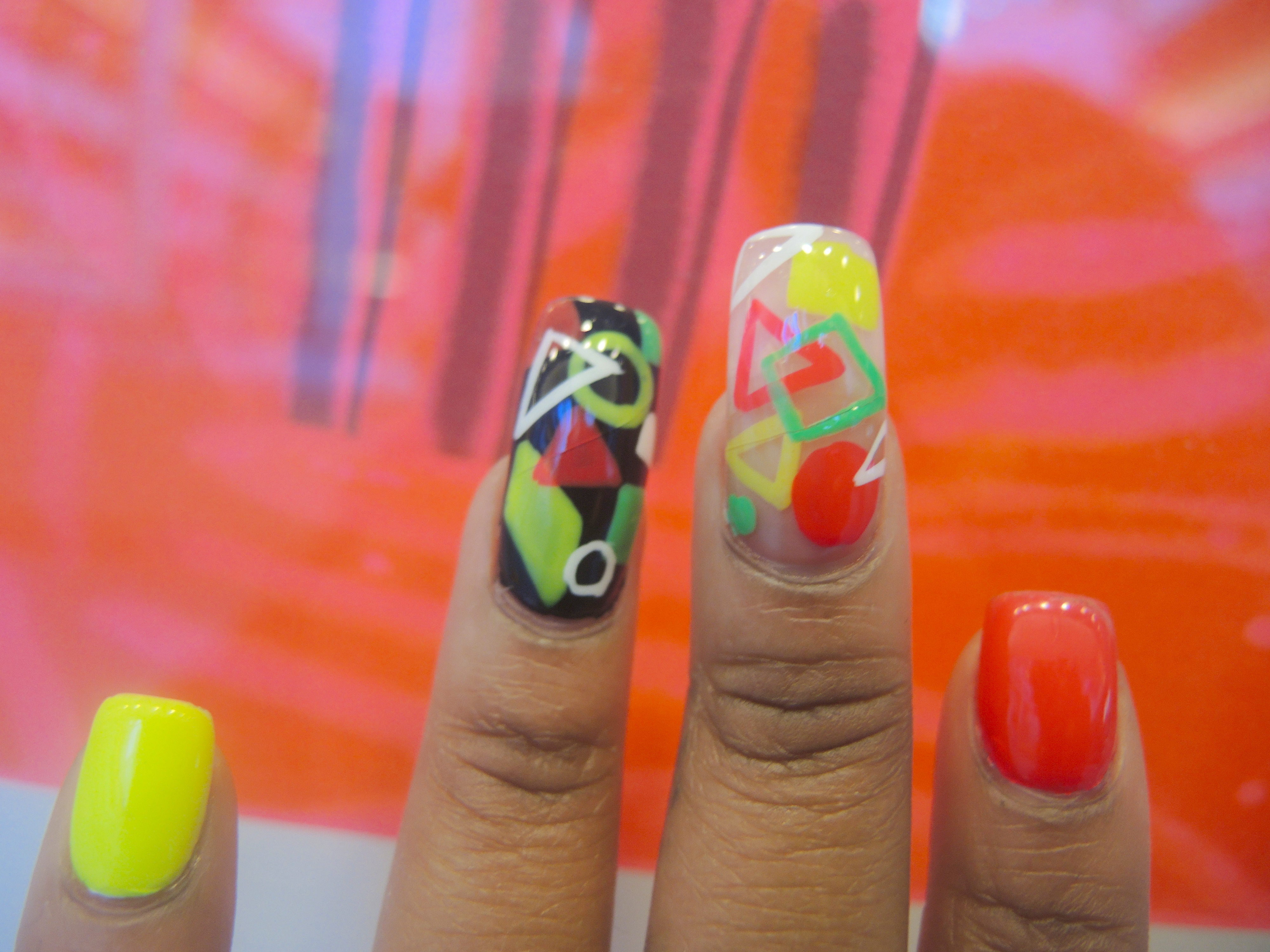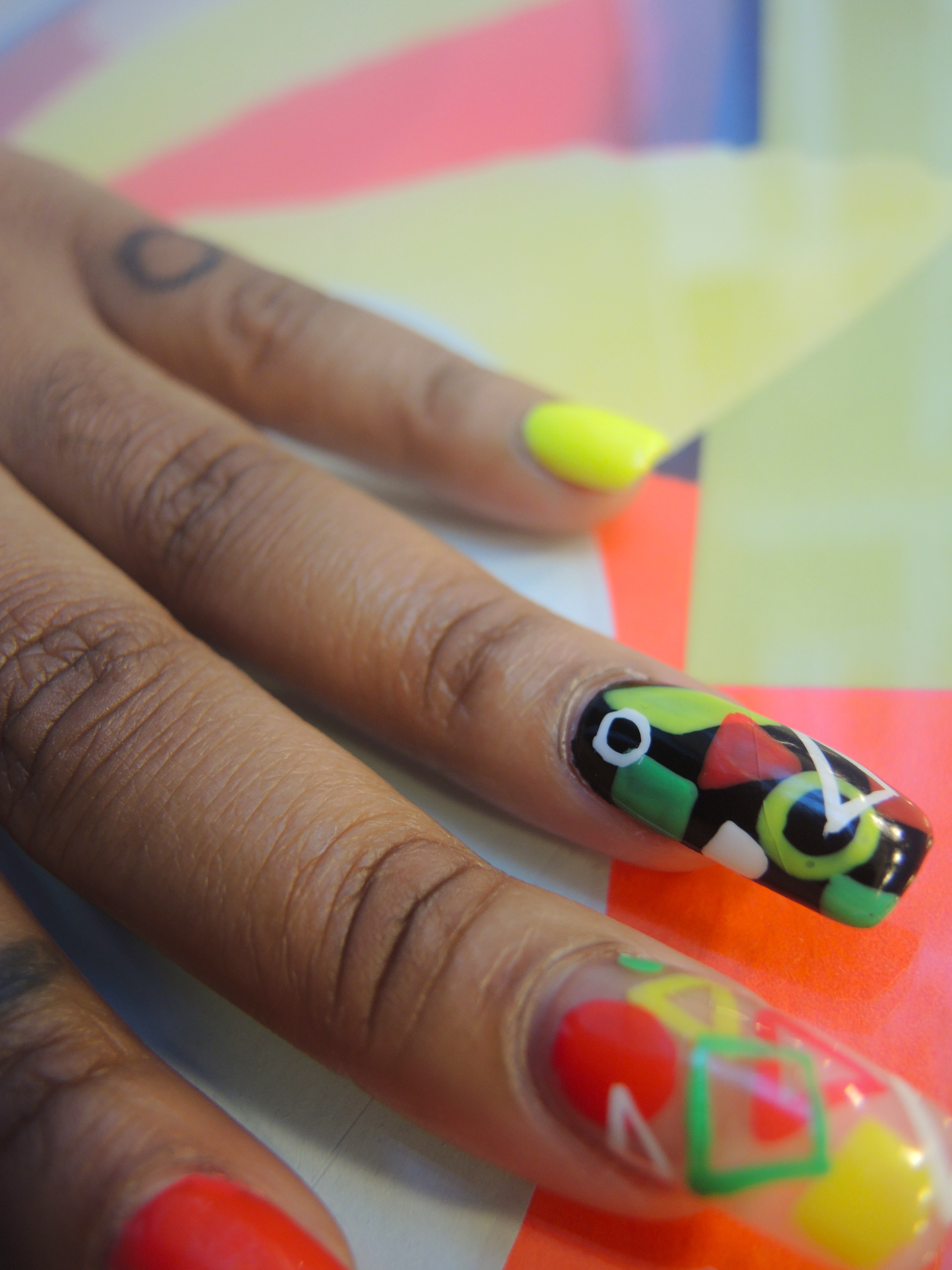 Nail Design: Positive spacing, are the compositions for my nail-art designs today. Focusing on the arrangements of silhouettes in: figures and shapes combined with, bold neons were used to preserve the concept- style and subversion.