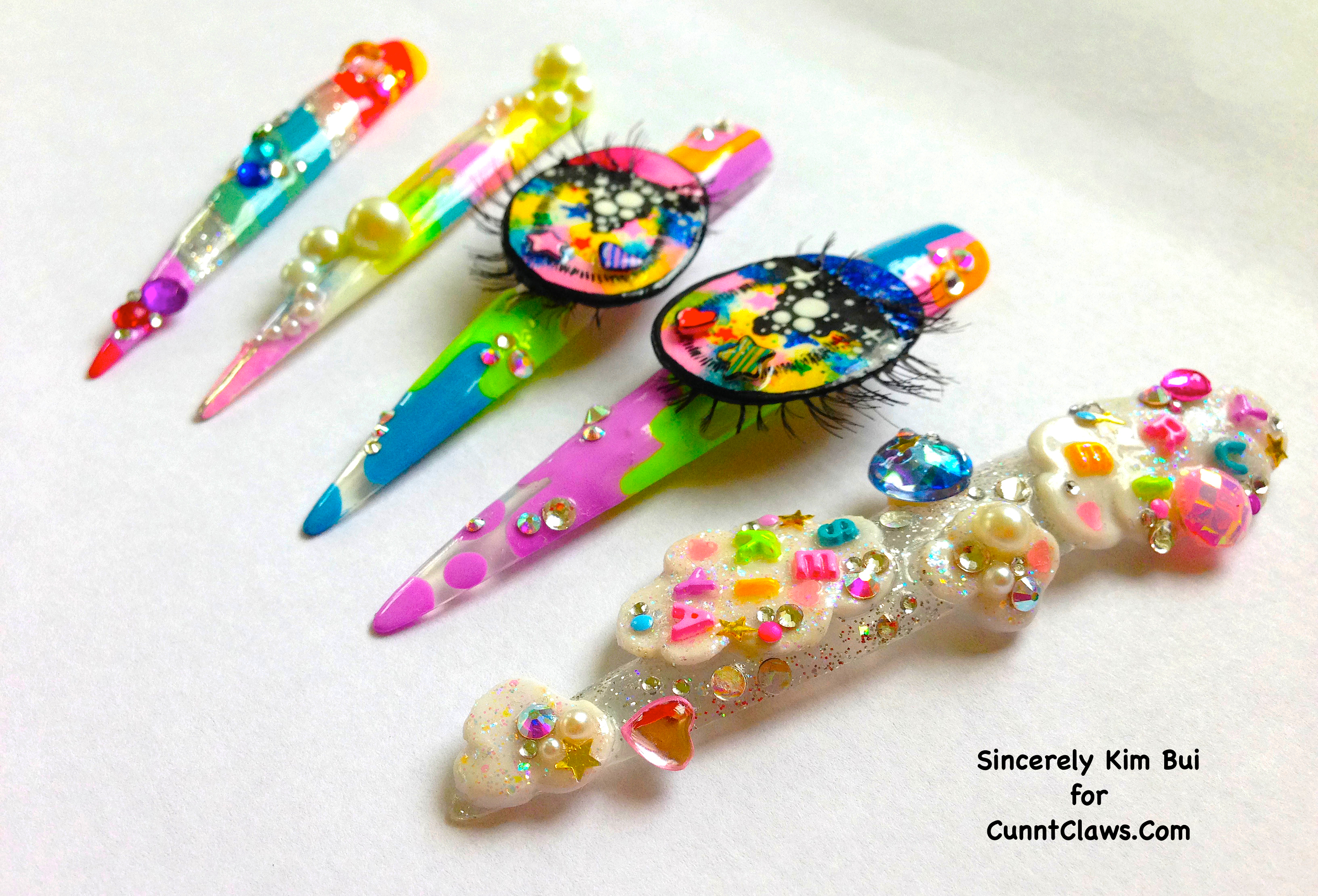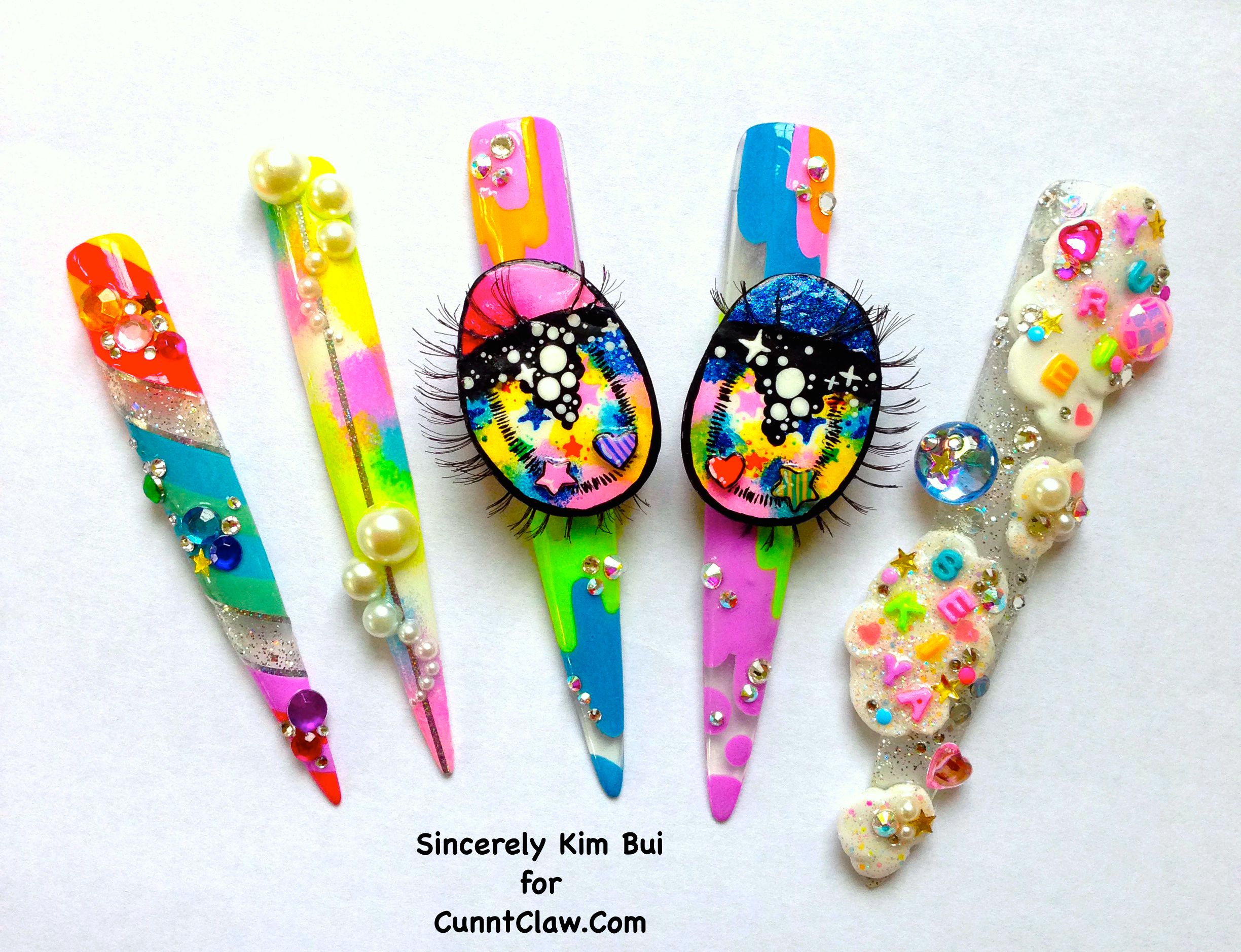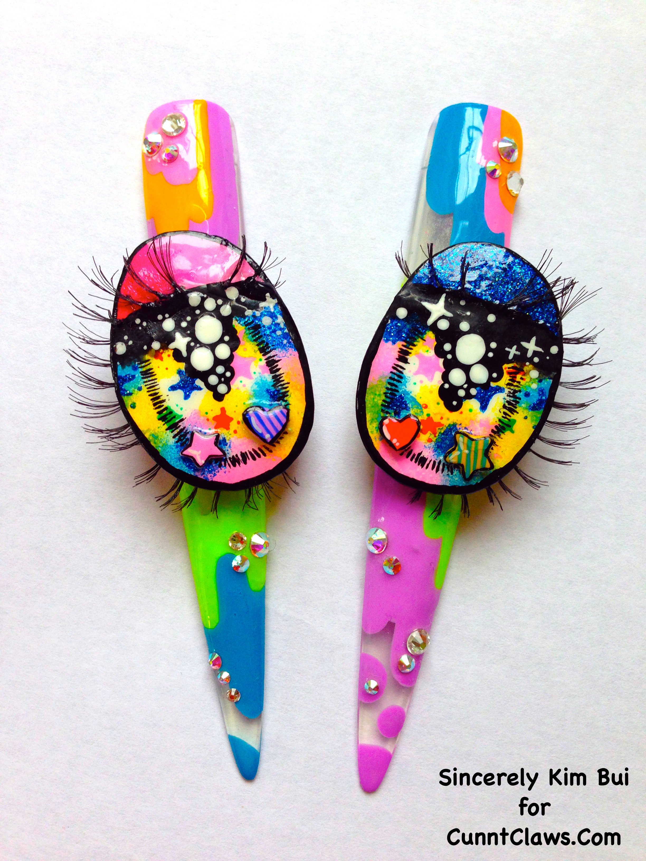Design HIGHlight: Bright-saturated colors, dreamy pastel, and 3d with a little bit of everything! These all matched Sekiya’s color palette. False eyelashes and sculpted acrylics to design the 3 dimensional portions the bold iconic eyes and cloud design. Last, added accents of :glitter, rhinestones, confetti, swarovski crystals, striping tape, studs, and PEARLS and nails-did!
