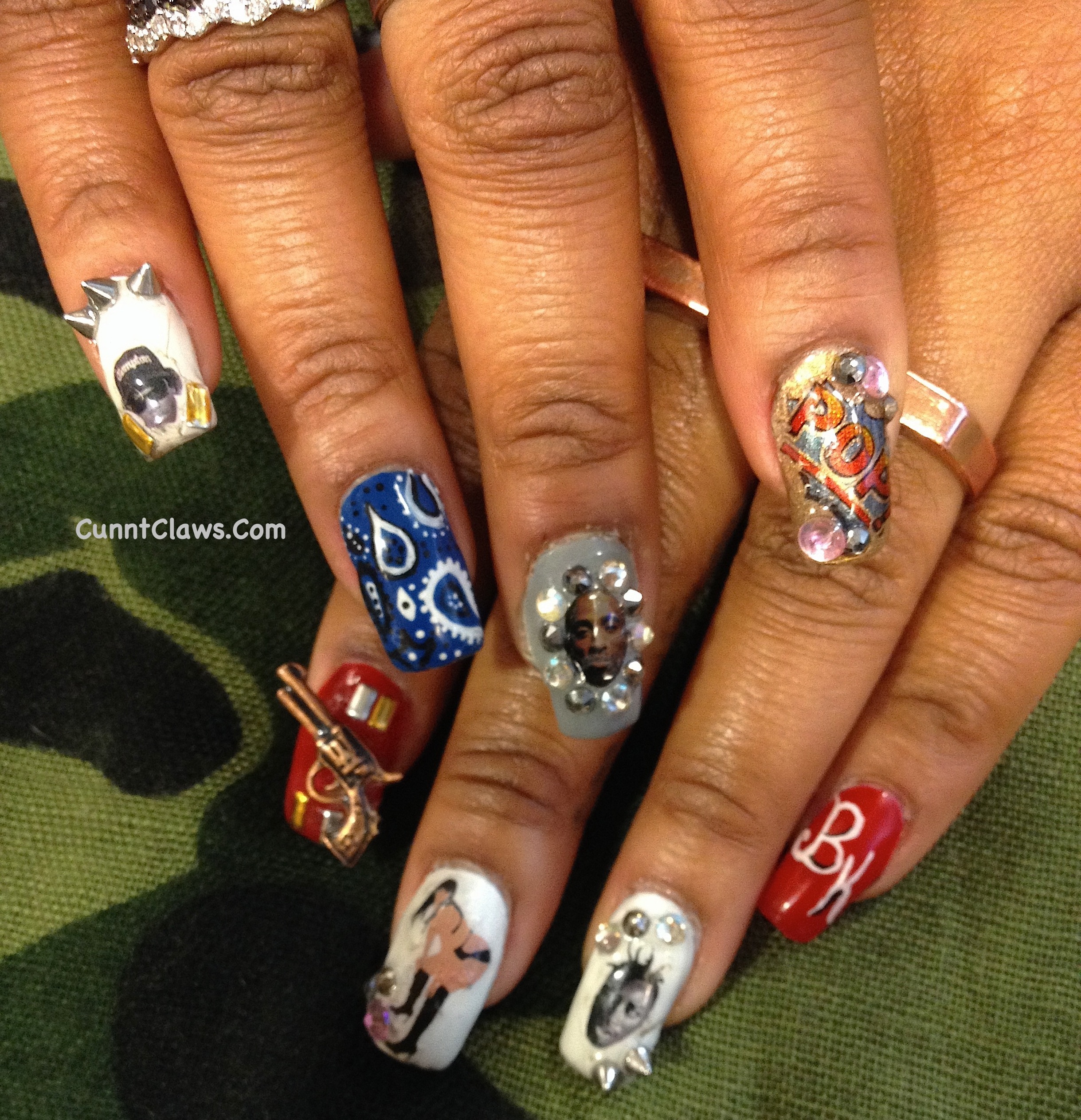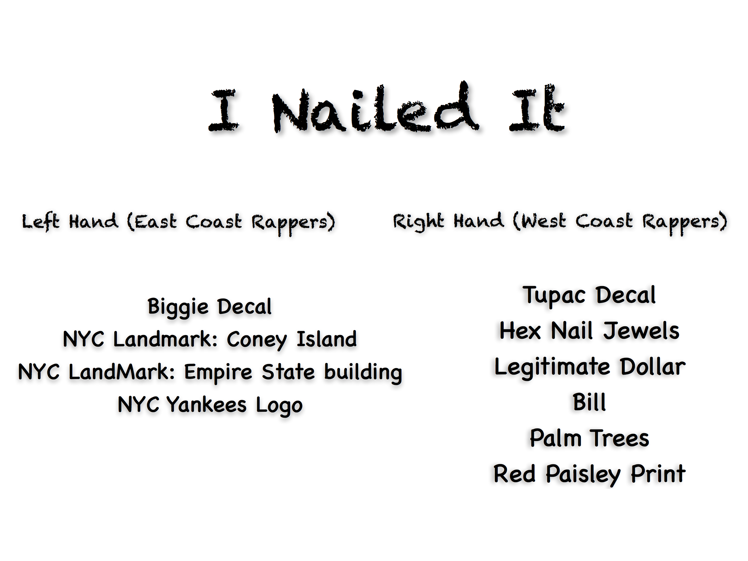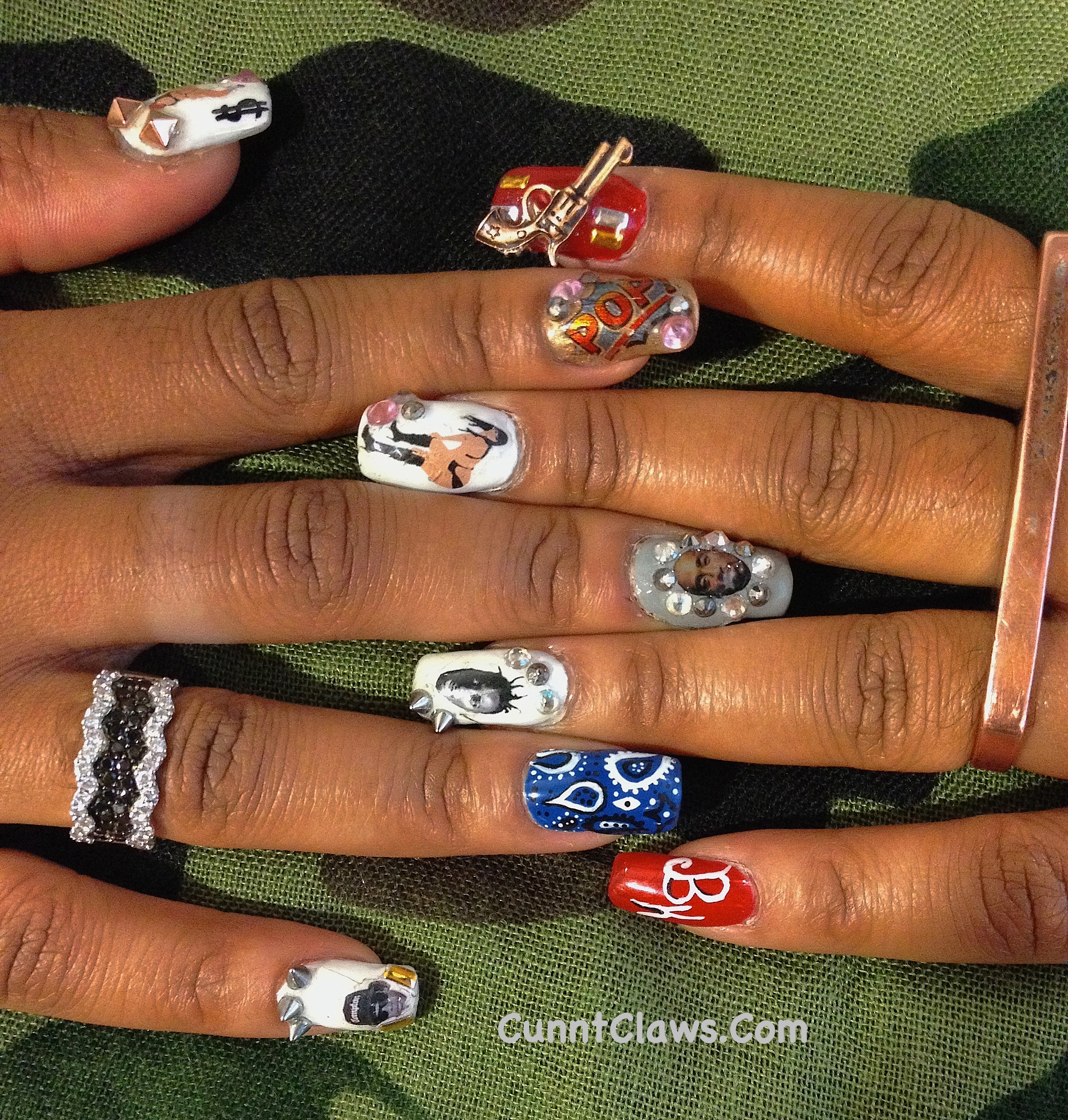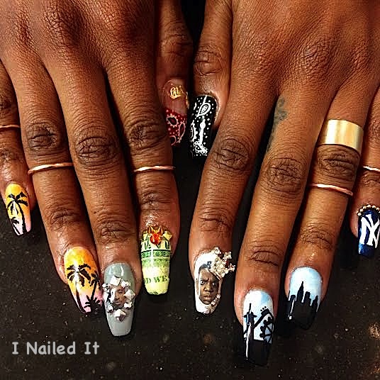 (Throw em’ up…Resurrected and on our claws!!!) Its nothing but a gansta nail party,while bringing the life back to some of hip-hop’s most influential rappers. East Coast nail art artist , Kelly (I Nailed It) and I teamed up to do a fun competition of “Nail Art Blogger v.s. Nail Artist” segment to pay tribute to the 1990’s rap game using nail decals courtesy of our favorite nail decal supplier, Dope Digits (East Coast!):