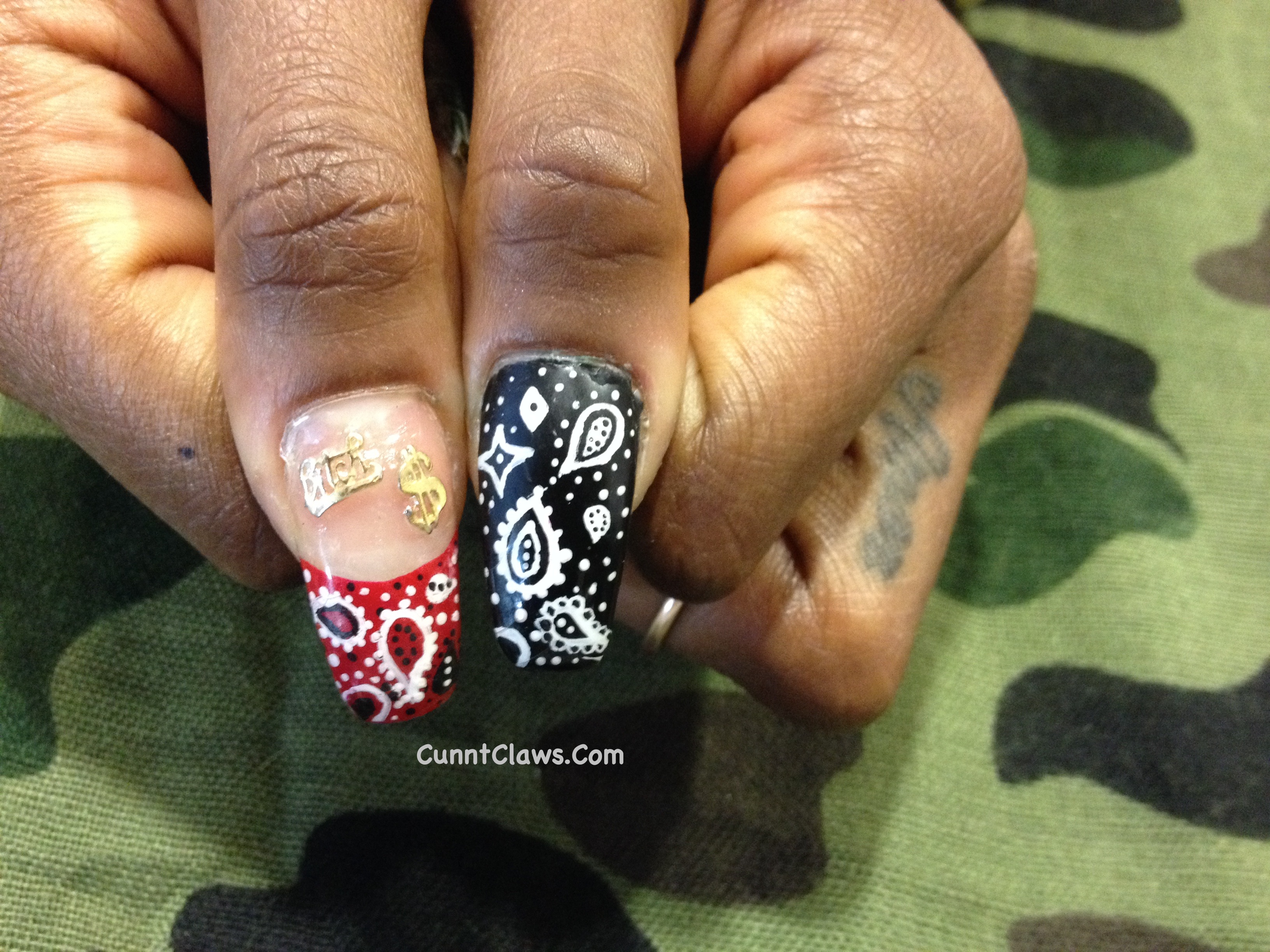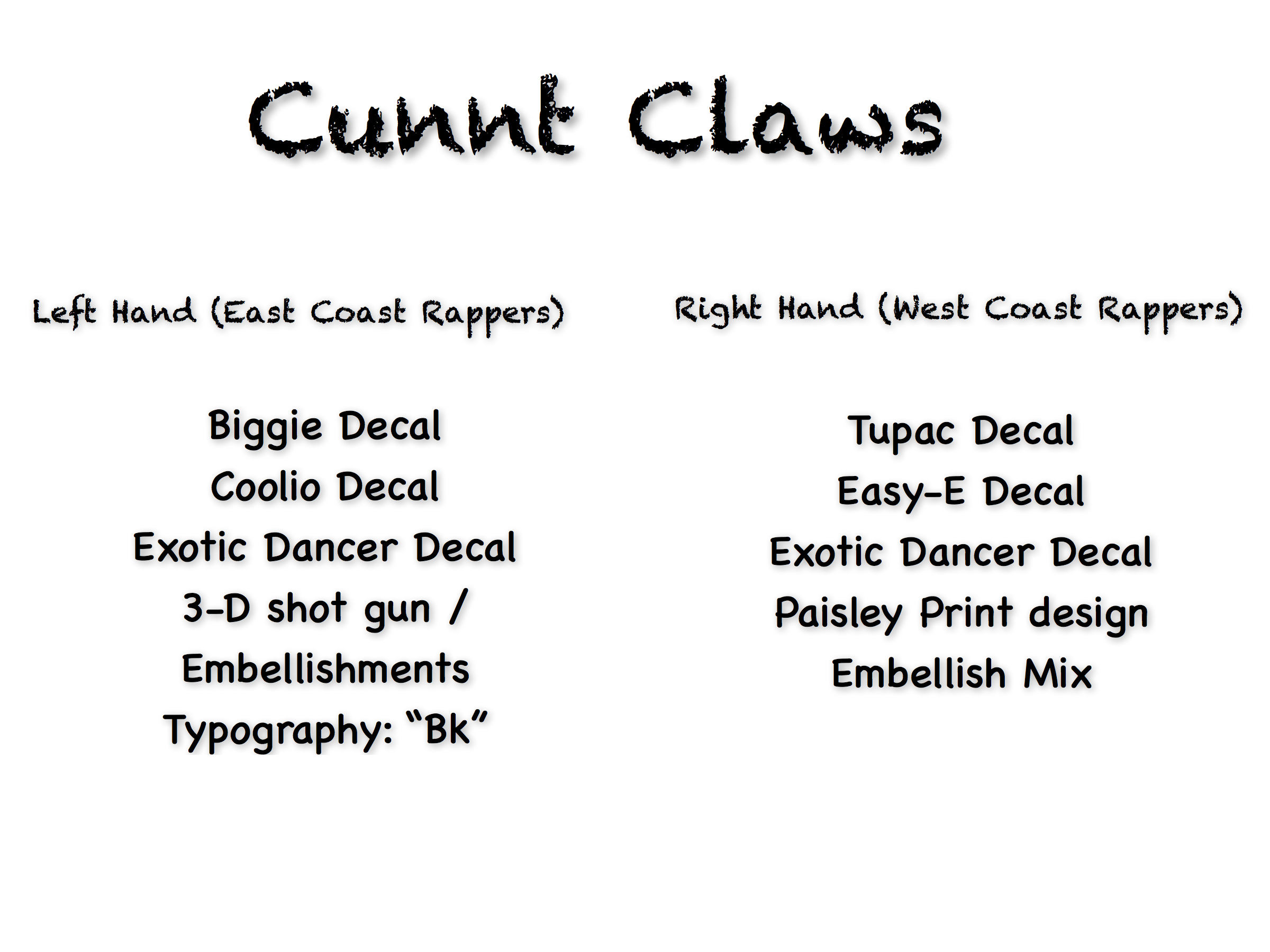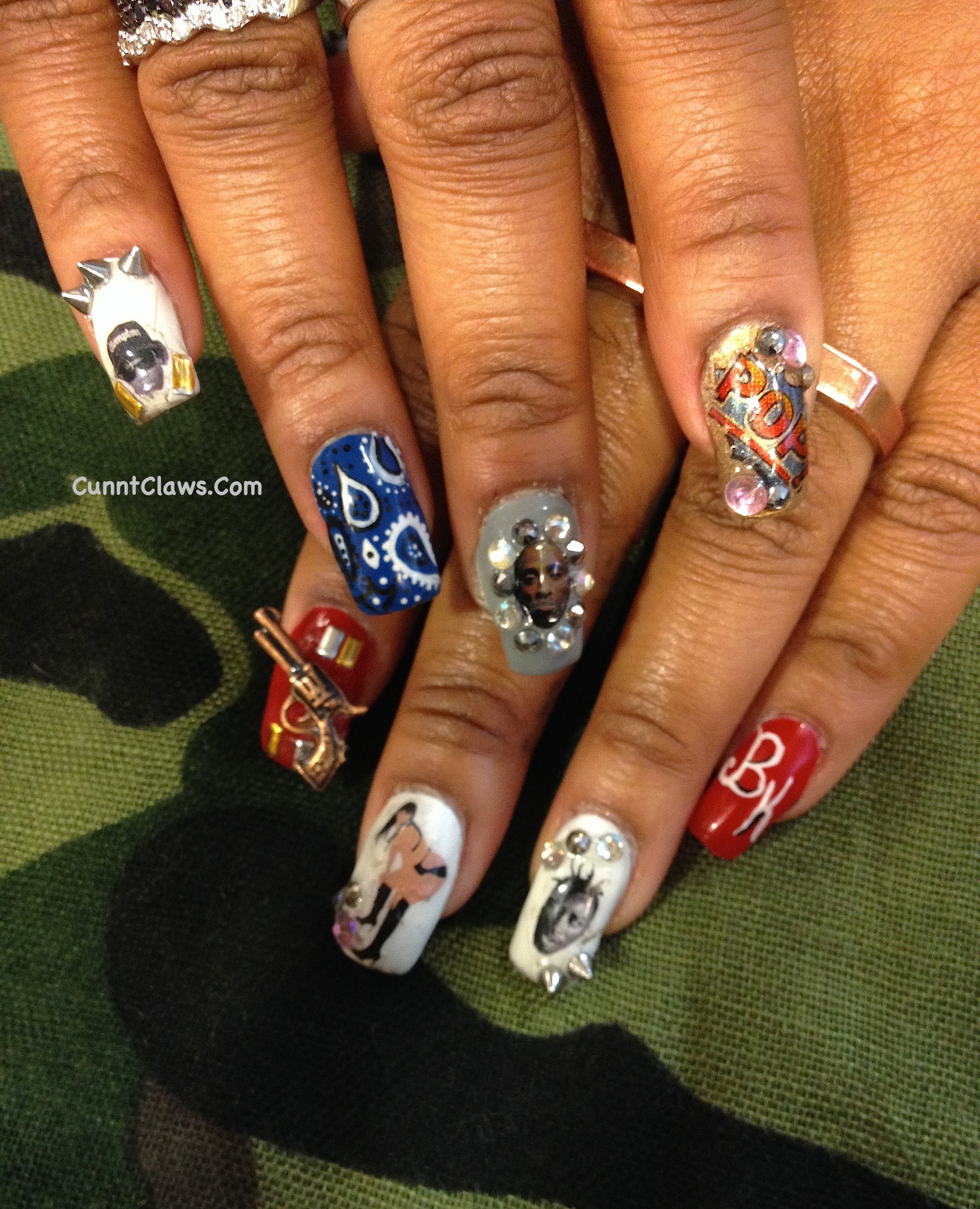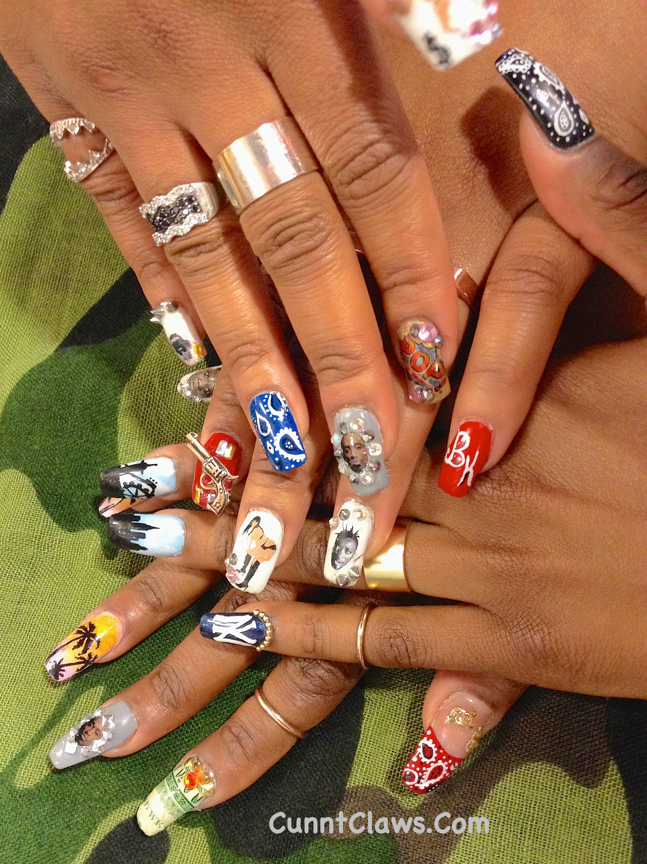 Honestly speaking, this has got to be the most disobedient concept to ride out. Due to the leverage from the 3-demensional jewels that are used, it was extremely hard to keep them on without them getting tangle onto something or snugged off from intense hand usage (It really bought the history of the east/west coast rap rivalry to perspective). Some of the jewels actually came off before I even got a chance to snap photos. Thanks to, Kelly who acted as “team save-ah-claw”, everything was back to perfection after couple of adjustments. My favorite are the “Exotic Dancer” decal- they are my “real-life” groupies h***, lol (Can’t conceptualize the rap game w/out groupies involve!) From Kelly’s nail set, I truly favored the, Coney Island landmark. Growing up as a child in Brooklyn, Coney Island was a place to escape and have fun with the homies. Which nail set do you favor: Cunnt Claws or I Nailed It?