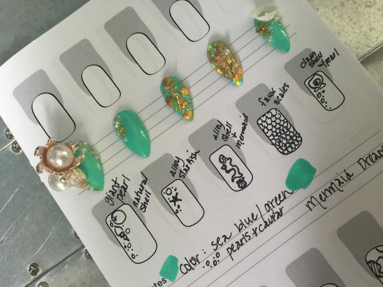 [Below] A visual of both the finish nail art and the detail sketches prior. Nailscupltress organizes her ideas, breaking down which materials are needed to execute the vision.