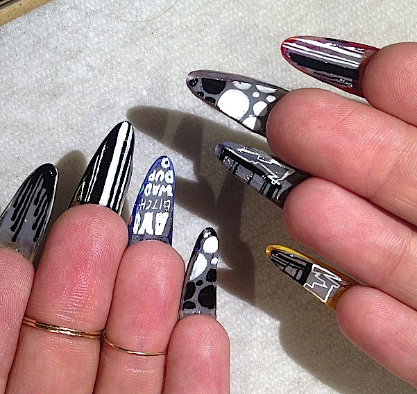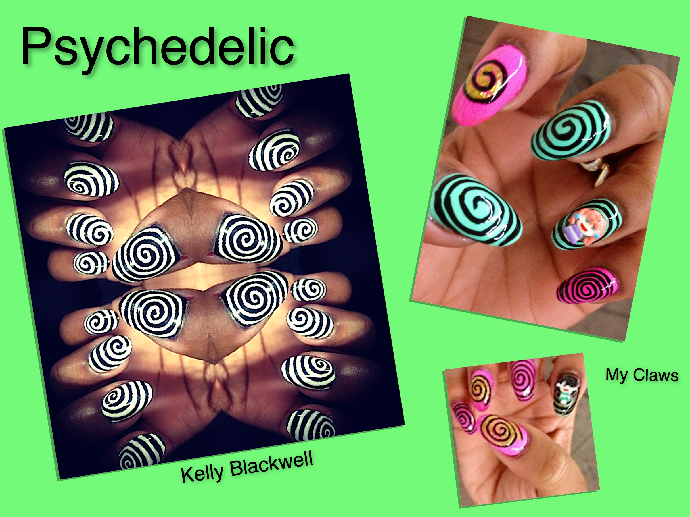 Here’s a lil fun for you guys!!! Two different instances of the Psychadelic print, and two different driven inspirations behind them! In the images above, you will see inspiring claws from nail artist, Kelly Blackwell….and my claws (rrrr!)
